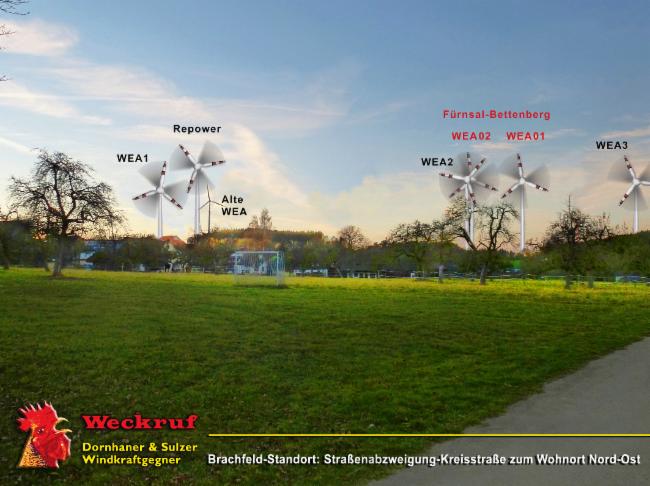 Die folgende Fotomontage zeigt, mit Blick aus Bettenhausen, die Standorte der auf dem Brachfeld geplanten Windkrafträder, maßstabsgerecht! Sieht man sich den Strommast als Größenvergleich an, wird klar, wie groß und dominierend die geplanten Windkrafträder wären: