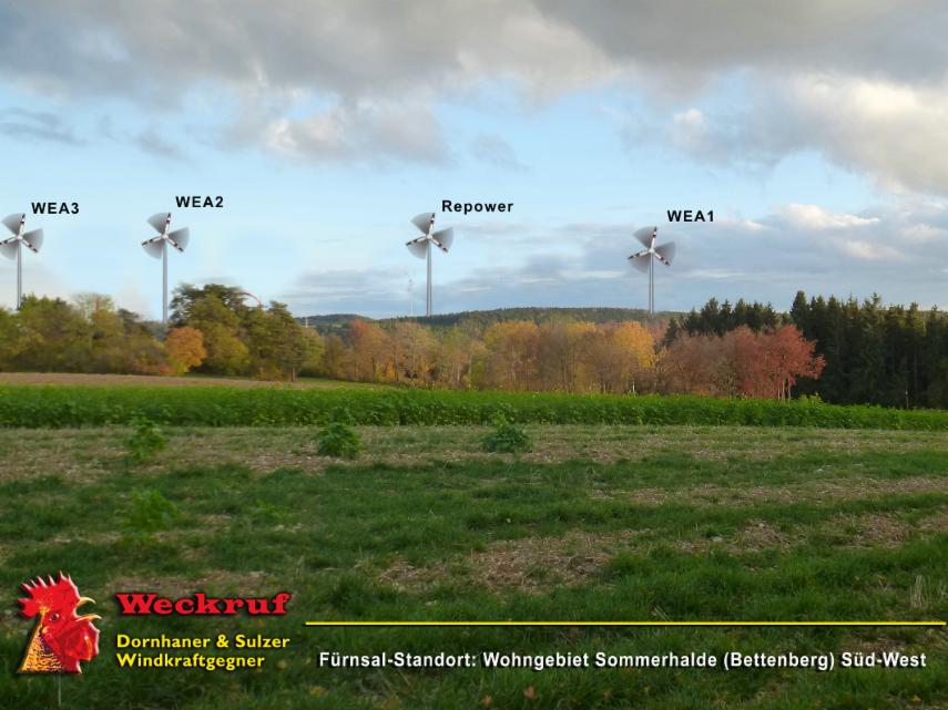 Diese Fotomontage zeigt die geplanten Windkrafträder mit Blick vom Sommerberg bei Leinstetten: